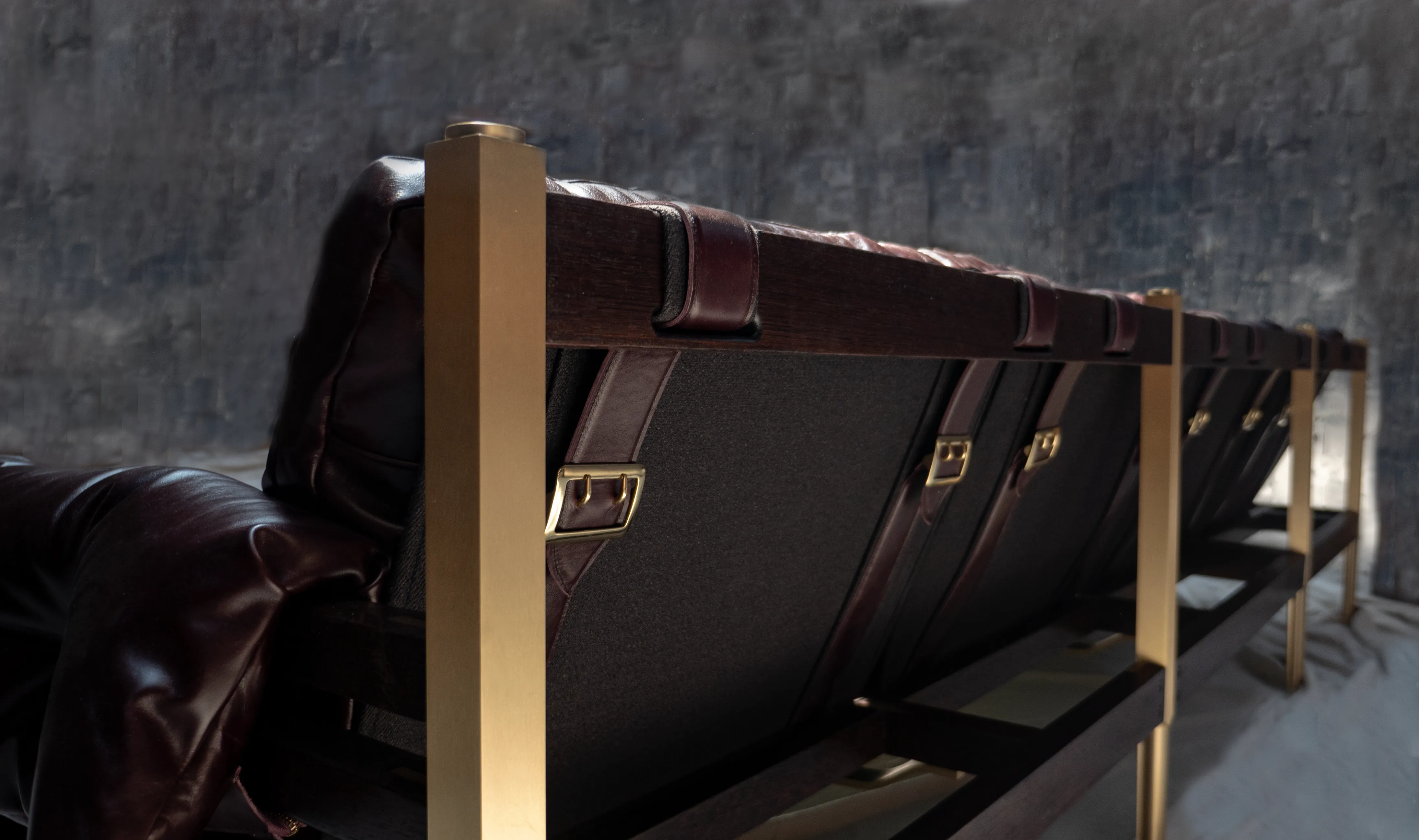 The Campanha collection is a creative mix of classical campaign furniture meets mid-century modernism. Infused with a rugged-meets-refined aesthetic, the collection’s tufted leather upholstery details are offset by careful and precise facets of turned brass and oiled wood.