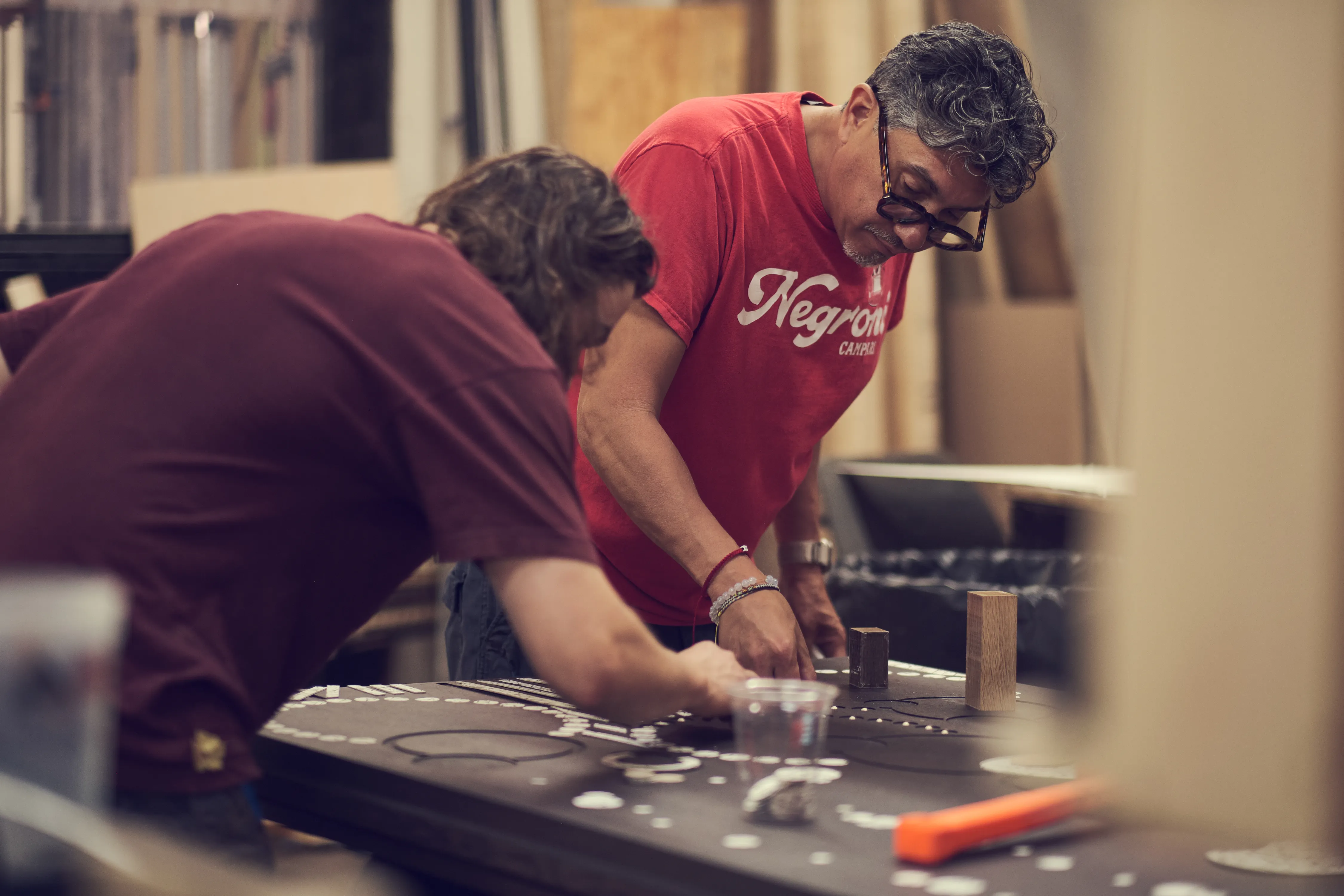 PATTERN NAME: Bubbles 01 DIMENSIONS: 96”L x 38”W x 30” H MATERIALS + FINISH AS SHOWN: TOP: Ebonized Wenge with Espresso Eggshell BASE: Ebonized Wenge